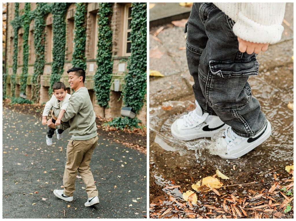 Some of my favorite photos are the ones of Atlas stomping in the rainy puddles, running like the wind, and beaming with laughter. Family photos that feel natural and personality-filled are always my favorite. 🙂 Capturing a family’s connection happens in those little in-between moments throughout the session. The best way to get photos that feel like you is to have fun at your session and focus on connection over perfection!