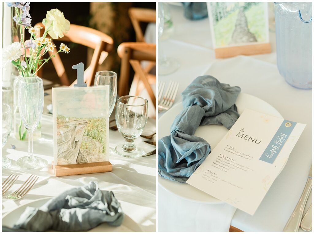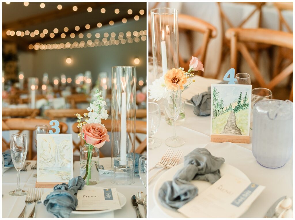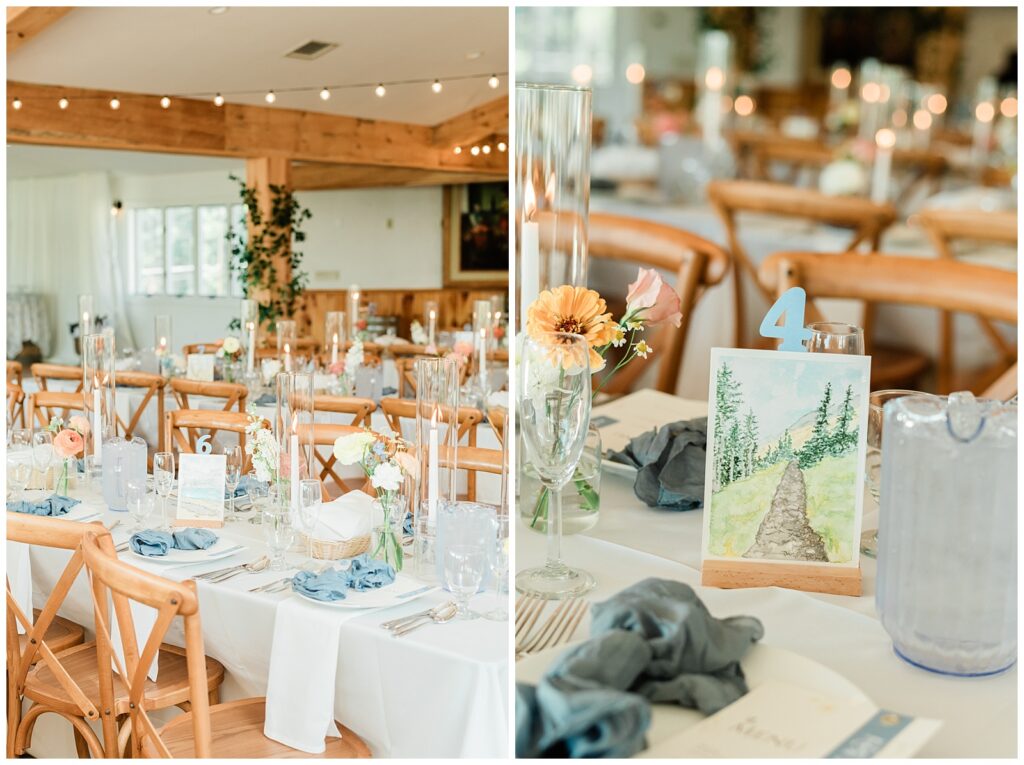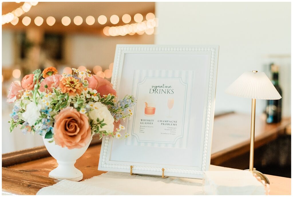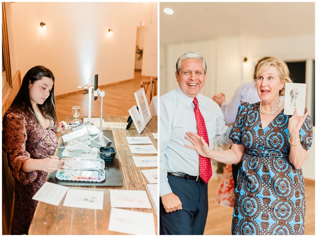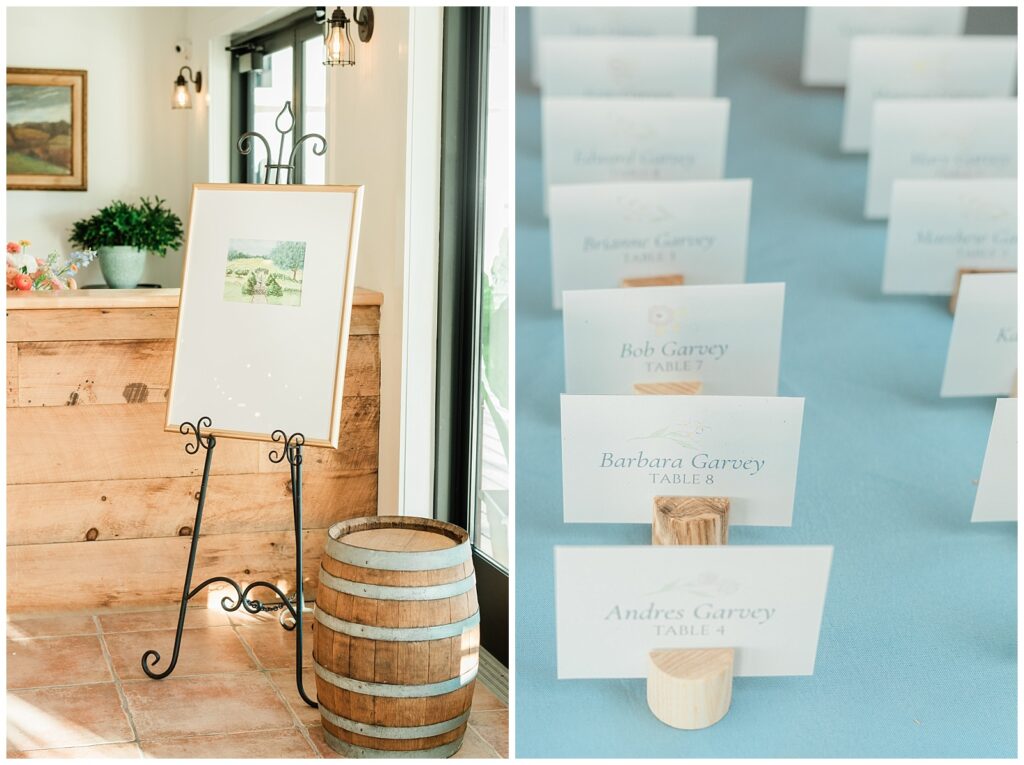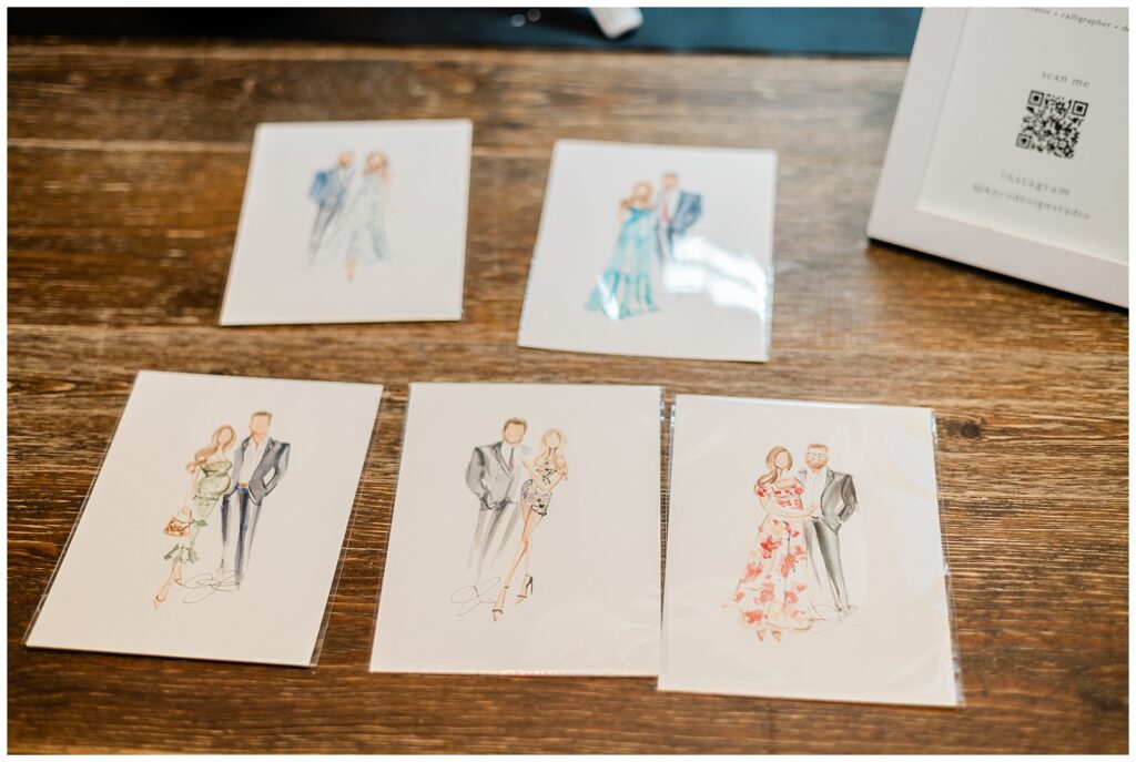 The invitations were a collaborative DIY effort by a very talented set of ladies! Kristin’s mom and sister painted the water color elements and Kristin designed them! Those art pieces were used in other signage throughout the day too! To continue on that watercolor theme, Kristin and David hire a super talented watercolor artist to paint the guests as favors during the reception!