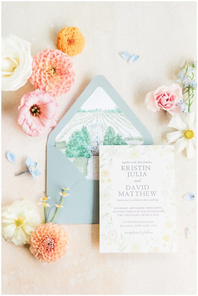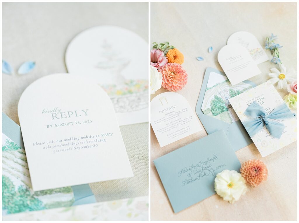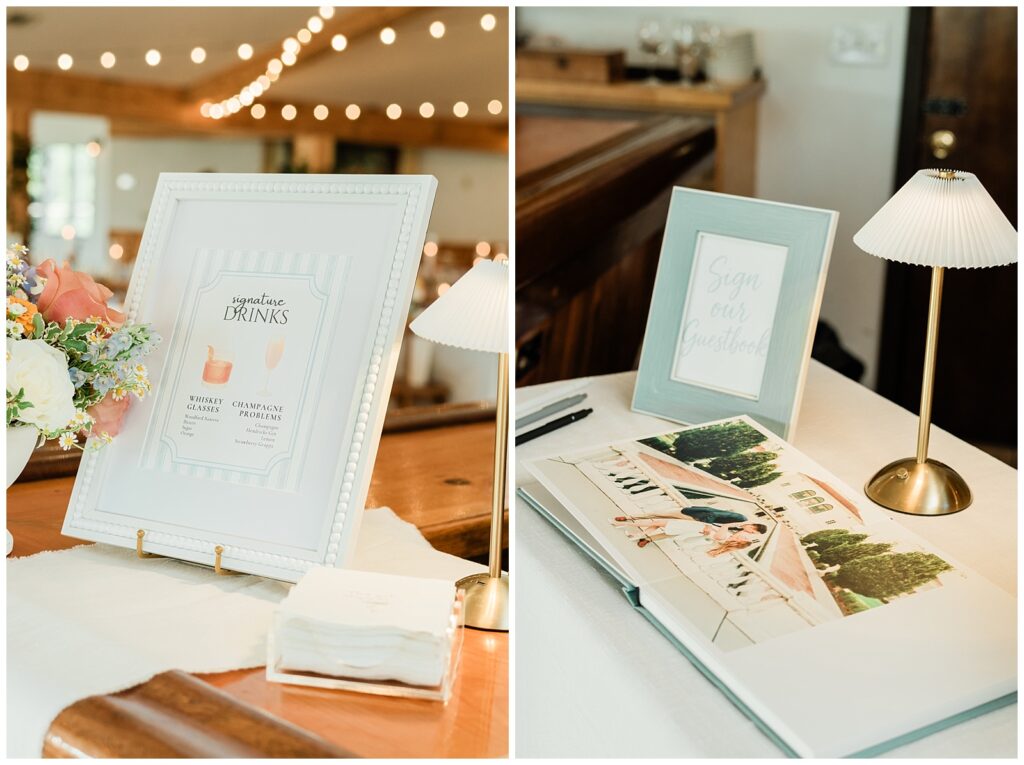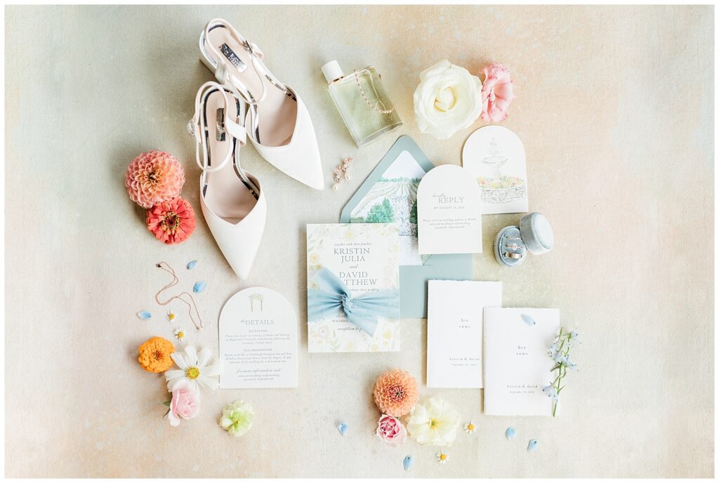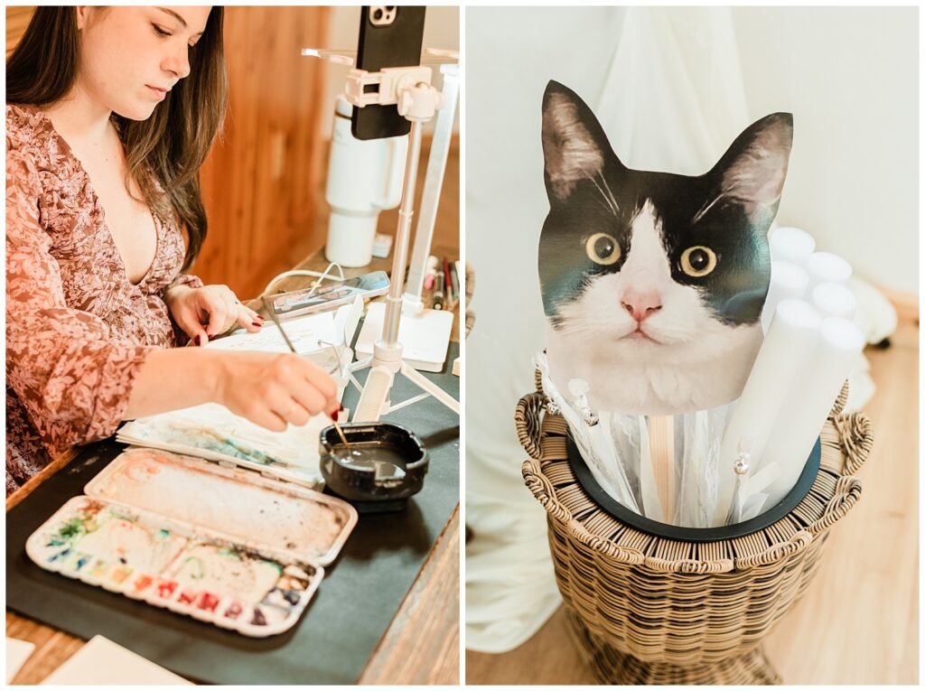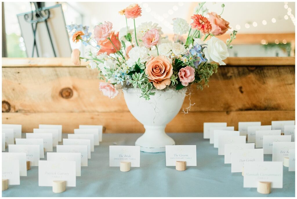 The invitations were a collaborative DIY effort by a very talented set of ladies! Kristin’s mom and sister painted the water color elements and Kristin designed them! Those art pieces were used in other signage throughout the day too! To continue on that watercolor theme, Kristin and David hire a super talented watercolor artist to paint the guests as favors during the reception!