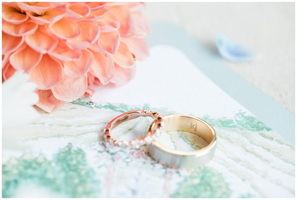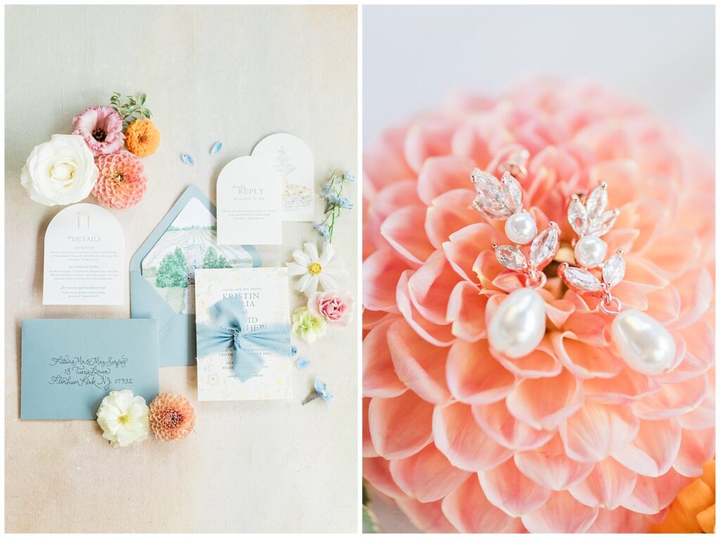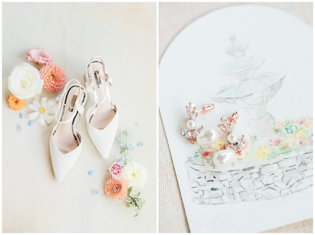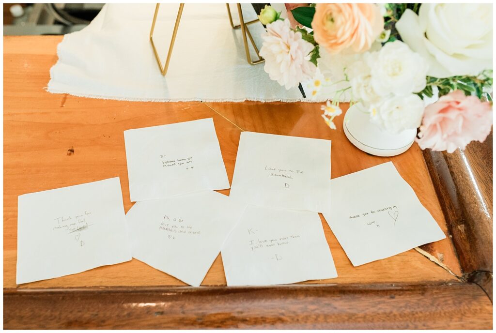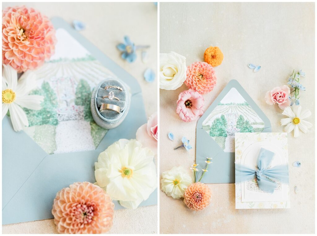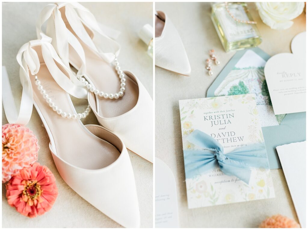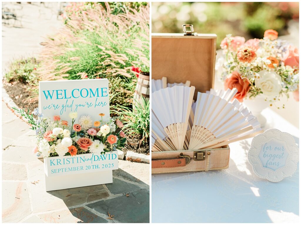 The invitations were a collaborative DIY effort by a very talented set of ladies! Kristin’s mom and sister painted the water color elements and Kristin designed them! Those art pieces were used in other signage throughout the day too! To continue on that watercolor theme, Kristin and David hire a super talented watercolor artist to paint the guests as favors during the reception!